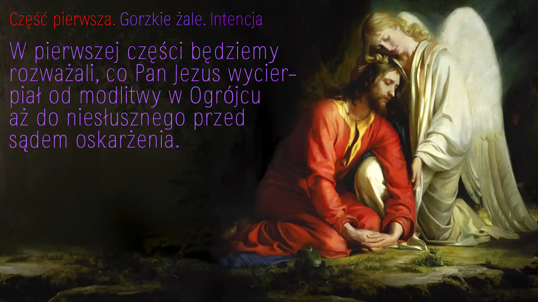 W pierwszej części będziemy rozważali, co Pan Jezus wycierpiał od modlitwy w Ogrójcu aż do niesłusznego przed sądem oskarżenia. Te zniewagi i zelżywości temuż Panu za nas bolejącemu ofiarujemy za Kościół święty katolicki, za najwyższego Pasterza z całym duchowieństwem, nadto za nieprzyjaciół krzyża Chrystusowego i wszystkich niewiernych, aby im Pan Bóg dał łaskę nawrócenia i opamiętania.