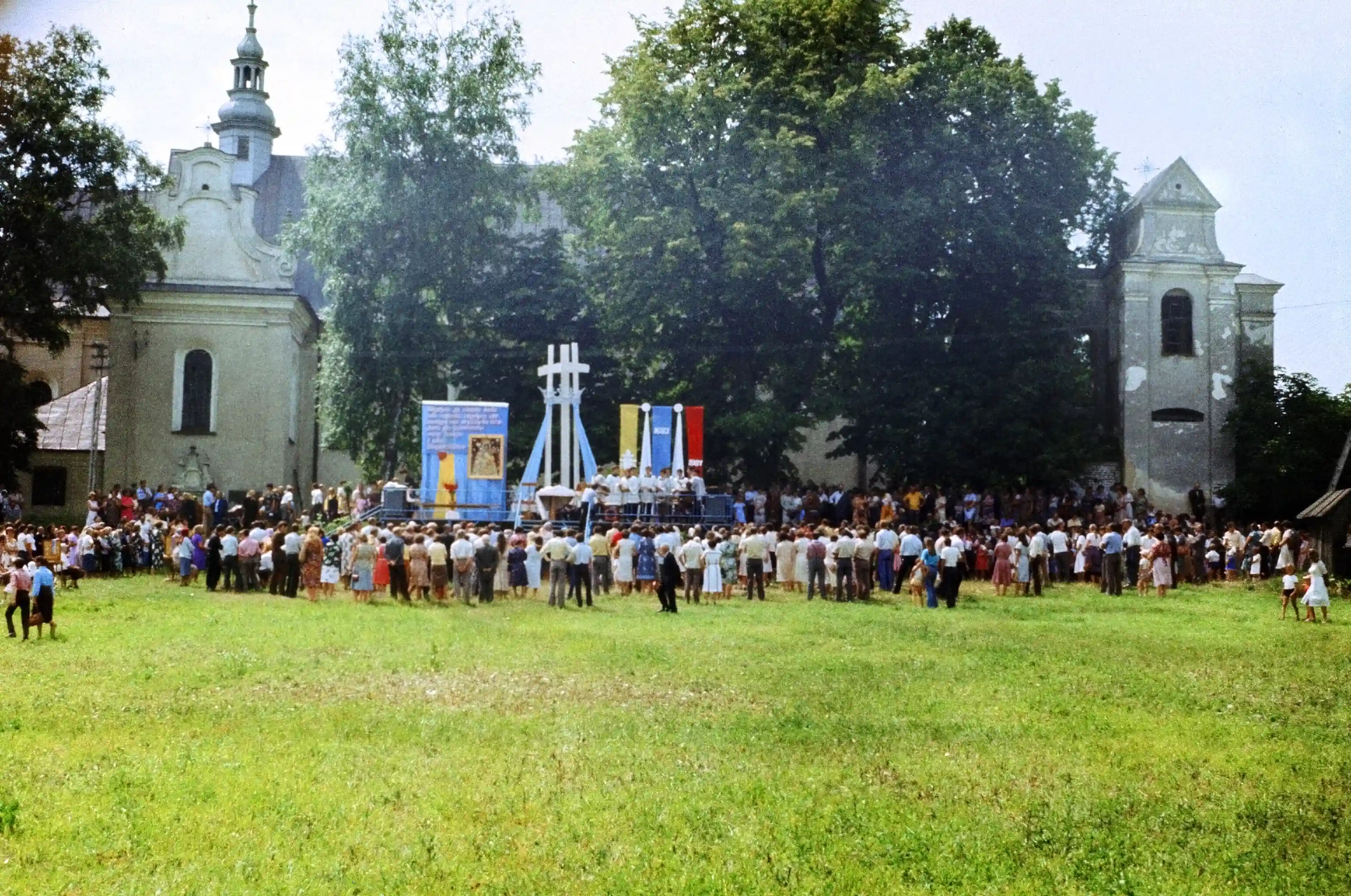 16/36. Kijany, 16-07-1981. Widok na ołtarz polowy i kościół.